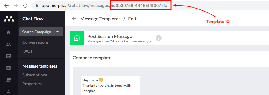 | accountId | This is the ID of your ‘WhatsApp Account’.Request this id by sending an email on support@morph.ai | Y |